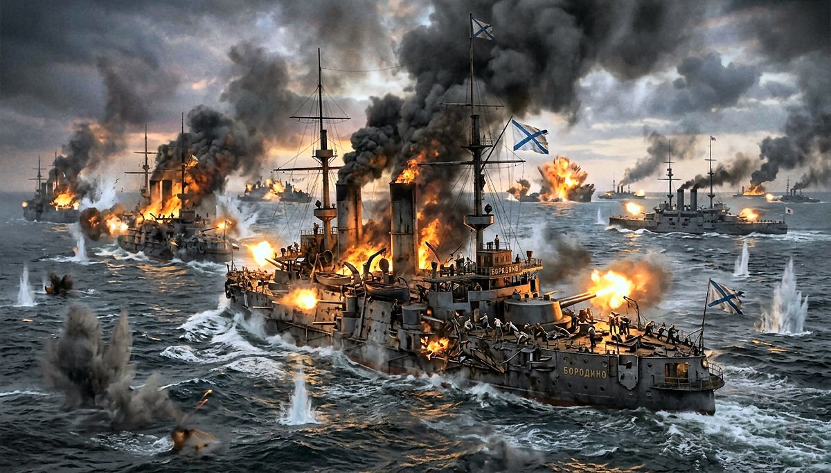 Para terminar, quando os barcos do Czar atingiram por fim as guas japonesas, foram facilmente derrotados pelos japoneses na Batalha de Tsushima, em maio de 1905, quando a frota russa foi destruda ou capturada em quase sua totalidade, enquanto os japoneses sofreram escassas baixas.