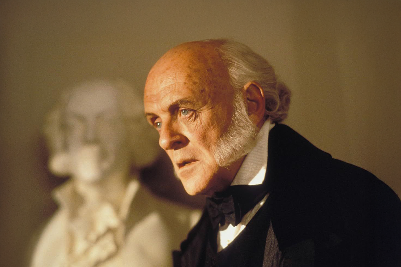 A partir da metade, Anthony Hopkins ganha espaço como John Quincy Adams. O ex-presidente aparece com o peso de quem domina precedentes e conhece o alcance político do caso. O grande discurso que coroa o arco dramático não se apoia em fogos retóricos. Há construção de argumento, remissão a documentos, apelo à memória dos fundadores e uma defesa direta da dignidade humana. Spielberg filma a fala com sobriedade: o enquadramento favorece o trabalho do ator e preserva o contracampo de Cinque, que escuta com atenção e devolve, com o olhar, a razão concreta de toda aquela retórica. A sequência impressiona pela contenção e pelo encaixe entre palavra e situação.