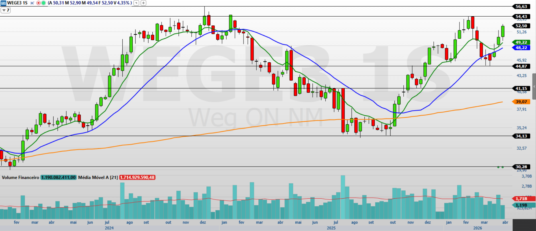 Na minha leitura, a WEG S.A. (WEGE3) segue com uma estrutura técnica sólida, mantendo o viés positivo mesmo após a leve realização recente. O ativo recuou 0,51% na última sessão, encerrando aos R$ 52,50, movimento que interpreto como ajuste pontual dentro de uma tendência de alta ainda preservada. No acumulado de 2026, o papel já sobe 8,43%, o que reforça o fluxo comprador e o interesse pelo ativo.