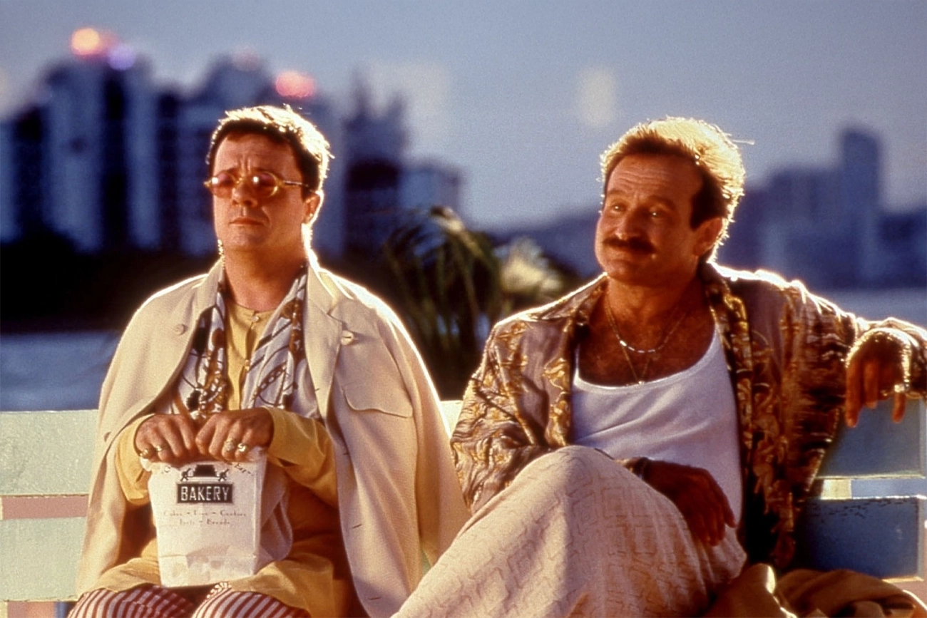 A comédia adaptada para o público norte-americano em “A Gaiola das Loucas” parte de um ponto simples: Armand, interpretado por Robin Williams, administra um clube em Miami onde o espetáculo e o exagero são parte da rotina, enquanto divide a casa e a vida com Albert, vivido por Nathan Lane, cuja identidade artística é o eixo de toda a dinâmica doméstica. A estabilidade construída pelos dois, sustentada por acordos tácitos e afetos sedimentados ao longo dos anos, perde o equilíbrio quando Val, filho de Armand e resultado de uma relação antiga com uma mulher, retorna com um pedido que reorganiza tudo: quer se casar com Barbara, interpretada por Calista Flockhart, filha de um político conservador defendido com rigidez por Gene Hackman. A partir desse anúncio, o filme monta uma rede de tensões que obriga Armand e Albert a renegociar a própria existência para caber na expectativa moral da família da noiva.