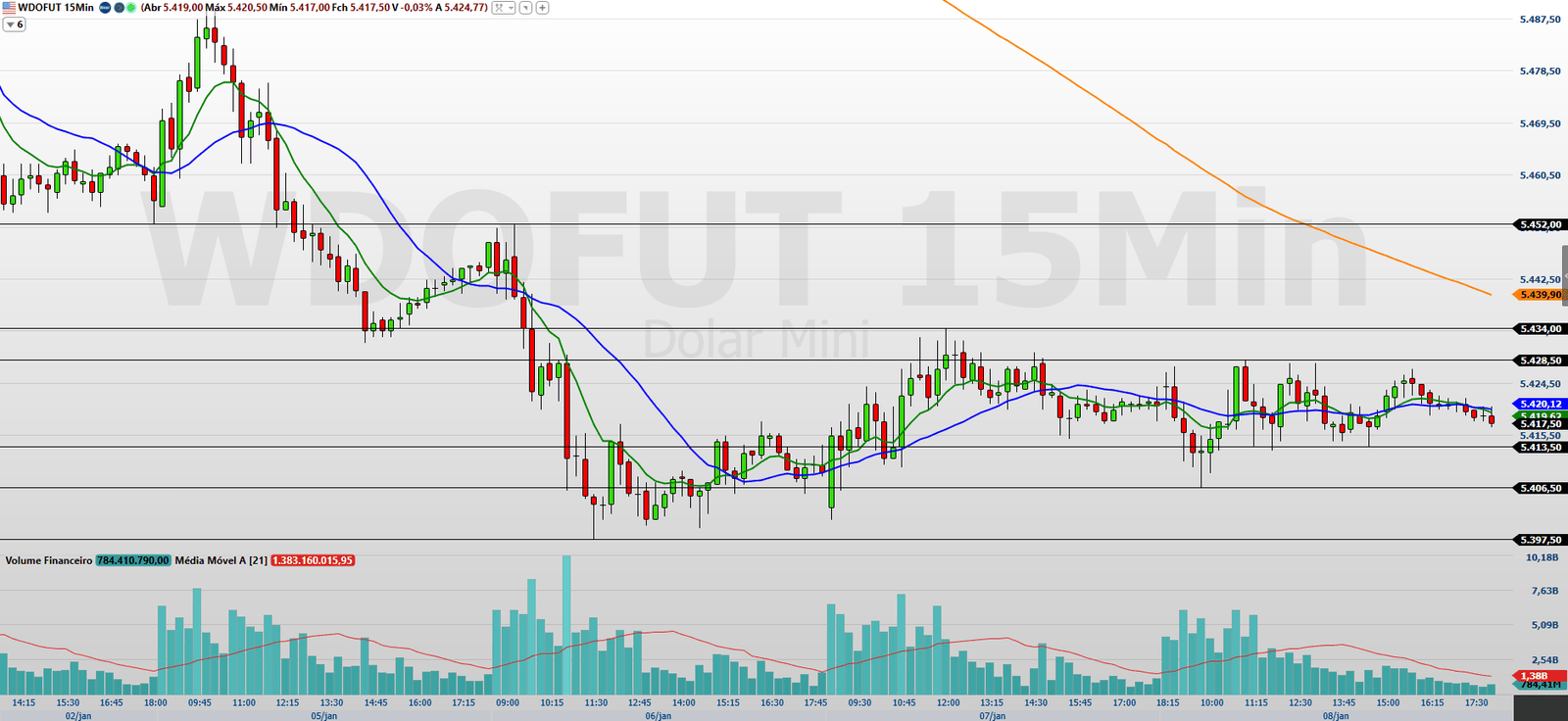No gráfico de 15 minutos, o minidólar fechou a última sessão em baixa e segue negociando abaixo das médias móveis de 9 e 21 períodos, o que mantém o viés mais defensivo no intraday. Para que haja retomada do movimento de alta, será necessária a entrada de fluxo comprador suficiente para romper a região de resistência em 5.428,5/5.434 pontos. Superado esse patamar, os próximos alvos passam a ser 5.452/5.471,5 pontos, com extensão até 5.486,5/5.491,5 pontos.