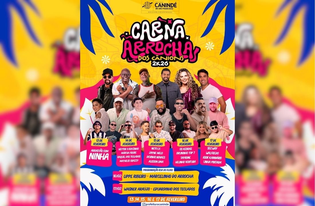 A Prefeitura de Canindé de São Francisco divulgou a programação oficial do CarnaArrocha dos Cânions 2026, que acontece de 13 a 17 de fevereiro.