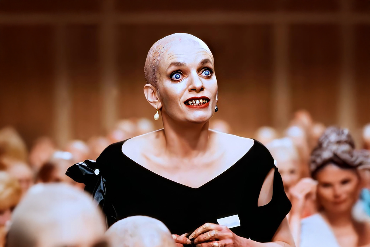 A direção de Nicolas Roeg aciona mudanças visuais só quando isso altera leitura. Quando a líder retira o disfarce perante o grupo, a sequência não é mera maquiagem, é prova que elimina dúvida e reposiciona toda aproximação futura no hotel. Quando a câmera acompanha o protagonista já transformado, rebaixa a altura do olhar e troca o mapa do cenário. O que era corredor vira campo aberto com riscos de todos os lados. Isso muda foco e prioriza obstáculos concretos, sapatos, rodapés, panelas, toalhas pendentes.