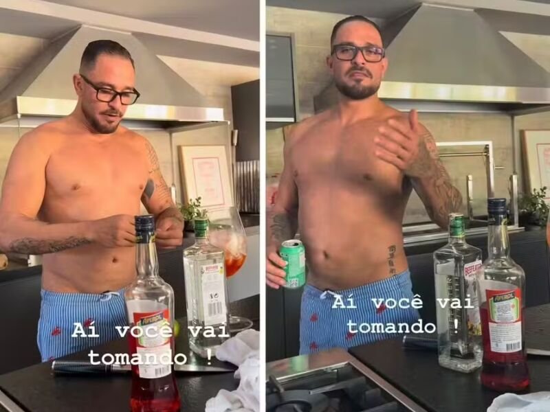 Com caipirinha, mas sem pé na areia e Paolla Oliveira. Diogo Nogueira surgiu nas redes sociais na tarde deste Natal, dia 25, celebrando a data em clima de família. Em um vídeo publicado por seu filho, Davi, de 19 anos, o cantor aparece na cozinha, de shorts e sem camisa, preparando um drinque alcoólico.