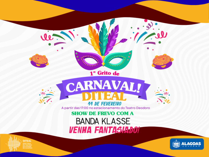 A Diretoria de Teatros do Estado de Alagoas (Diteal) promove, no dia 11 de fevereiro, a partir das 17h, o 1º Grito de Carnaval Diteal, evento especial para celebrar a alegria, a cultura e o espírito carnavalesco.