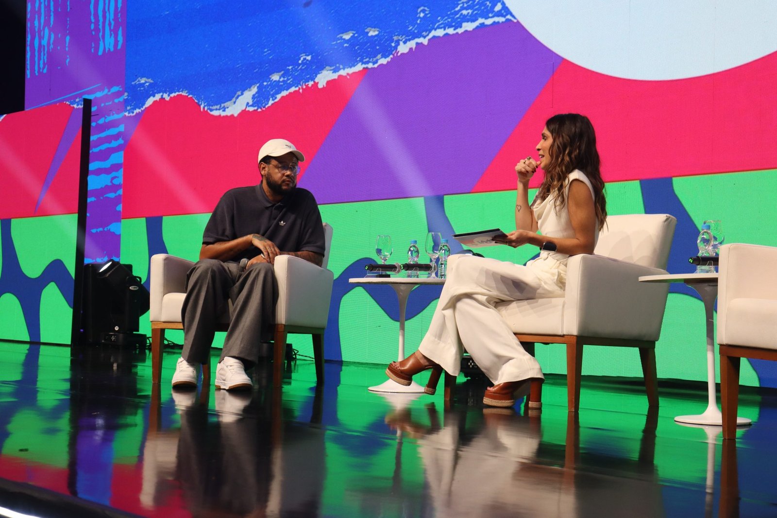 Logo no início, Sarah destacou o impacto do novo disco do artista e puxou um dos temas centrais da conversa: a importância da compreensão como caminho para o perdão. A partir daí, Emicida passou a falar sobre o chamado “lado B” — aquilo que carrega sombras, contradições e vulnerabilidades. Para ele, esse lado não é oposto à luz, mas parte dela. “Qual o sentido do trabalho se eu não posso ocupar esse espaço sendo eu por inteiro?”, questionou.