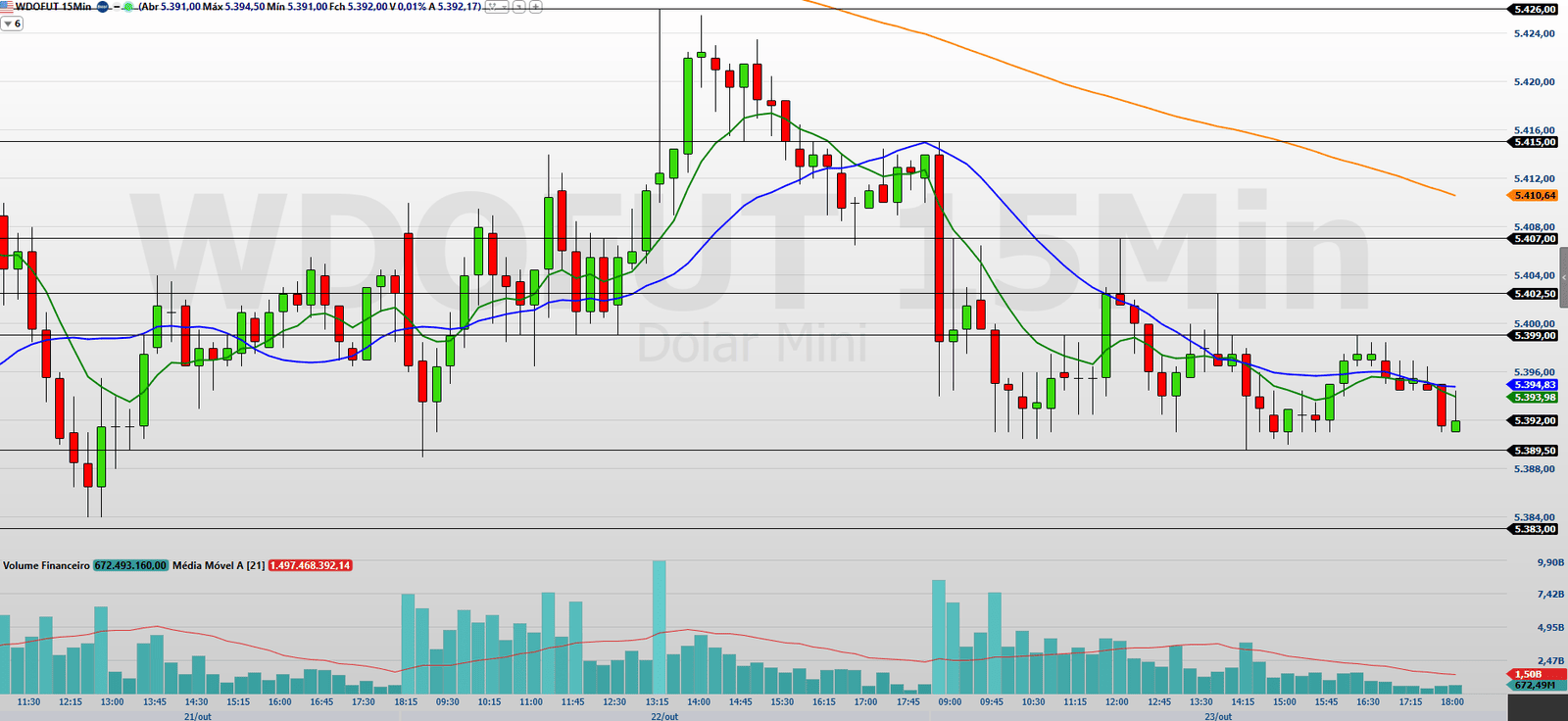 Os contratos de minidólar (WDOX25), com vencimento em novembro, encerraram a última sessão (23/10) em queda de 0,41%, cotados a 5.392 pontos. O movimento acompanhou o recuo global da moeda americana frente a pares emergentes, em um dia de alta do petróleo e cautela antes da divulgação do CPI dos EUA, que deve influenciar a decisão de juros do Fed na próxima semana.