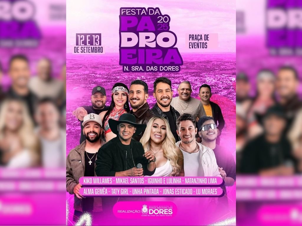 A Festa da Padroeira 2025 do município de Nossa Senhora das Dores será realizada nos dias 12 e 13 de setembro, na Praça de Eventos da cidade, reunindo atrações regionais e nacionais que prometem movimentar o público durante dois dias de celebração.