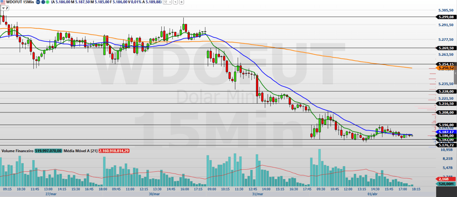 No gráfico de 15 minutos, observo que o minidólar fechou em baixa, mantendo o fluxo vendedor e negociando abaixo das médias móveis de 9 e 21 períodos, o que reforça a pressão negativa no curto prazo.