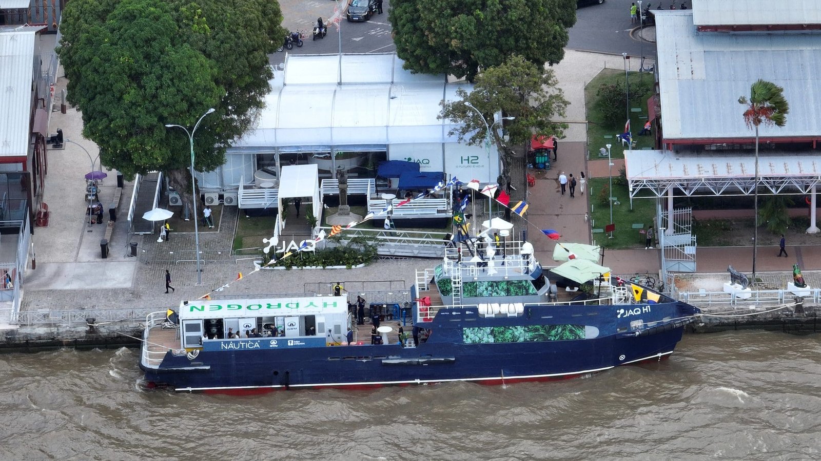 O JAQ H1, da empresa Jaq Apoio Marítimo, possui 36 metros de comprimento, cerca de 400 m² de área útil e auditório para cinquenta pessoas. A embarcação foi apresentada na COP30 com toda a hotelaria preparada para operar com hidrogênio verde, incluindo iluminação, climatização e sistemas internos. Em dezembro, em Fortaleza (CE), será instalada a propulsão dual fuel da MAN, que utiliza 20% de hidrogênio na mistura e pode reduzir em até 80% as emissões de CO₂. Em seguida, o barco seguirá para o Porto de Suape (PE) para abastecimento.