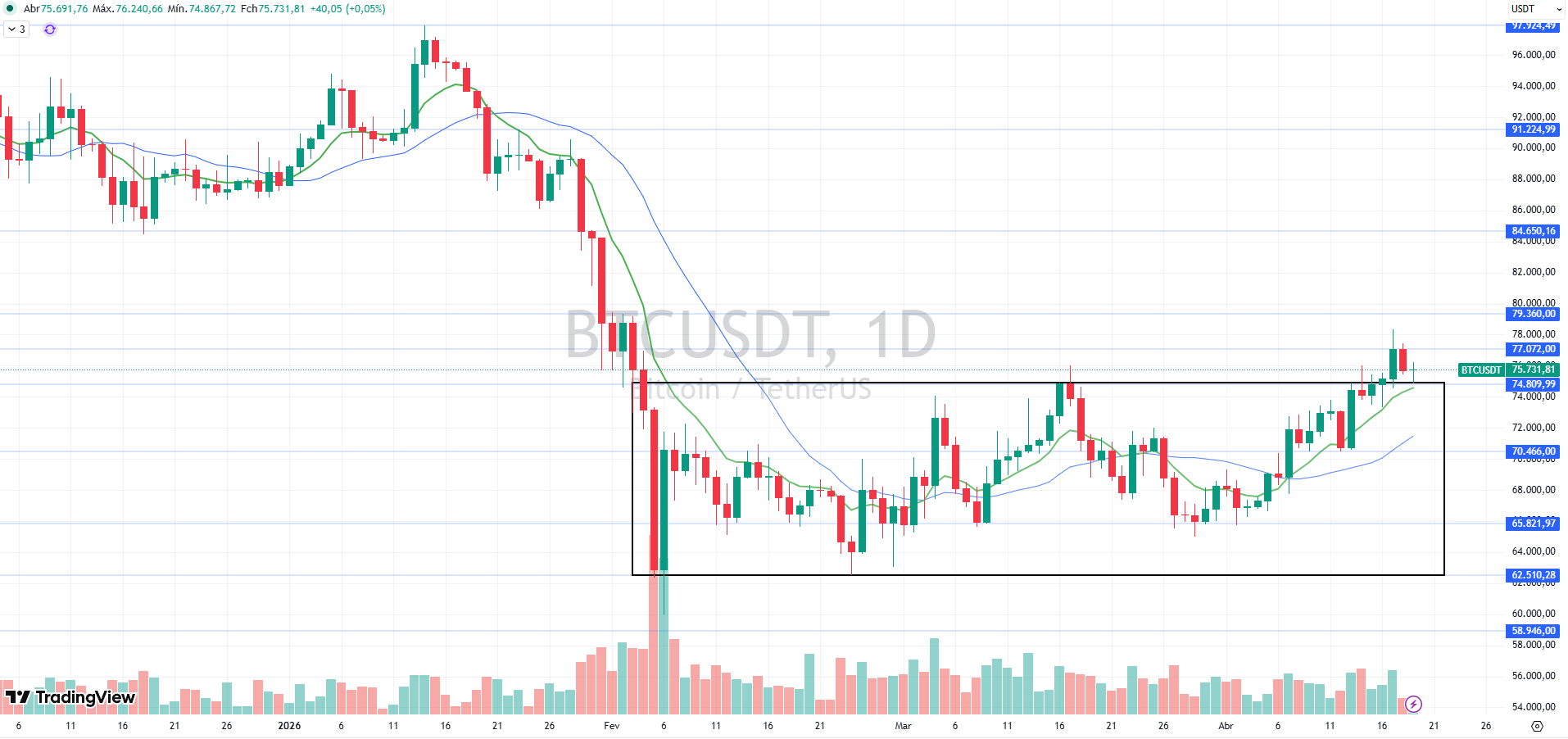 Em abril, a criptomoeda acumula alta superior a 10%, reforçando a retomada compradora. O ponto-chave agora está no rompimento da lateralização recente.