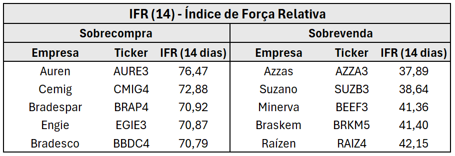 Além disso, o IFR permite a aplicação de técnicas como suportes, resistências, divergências e figuras gráficas. A partir disso, segue as cinco ações mais sobrecomprados e sobrevendidos do Ibovespa: