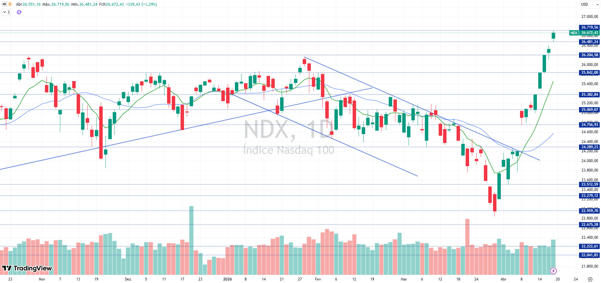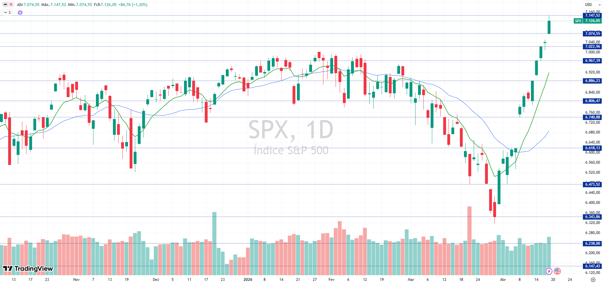 O S&P 500 também mantém viés construtivo, registrando a terceira semana consecutiva de ganhos e encerrando todas as sessões recentes em alta. O índice opera aos 7.126 pontos, com valorização de 9,15% em abril.