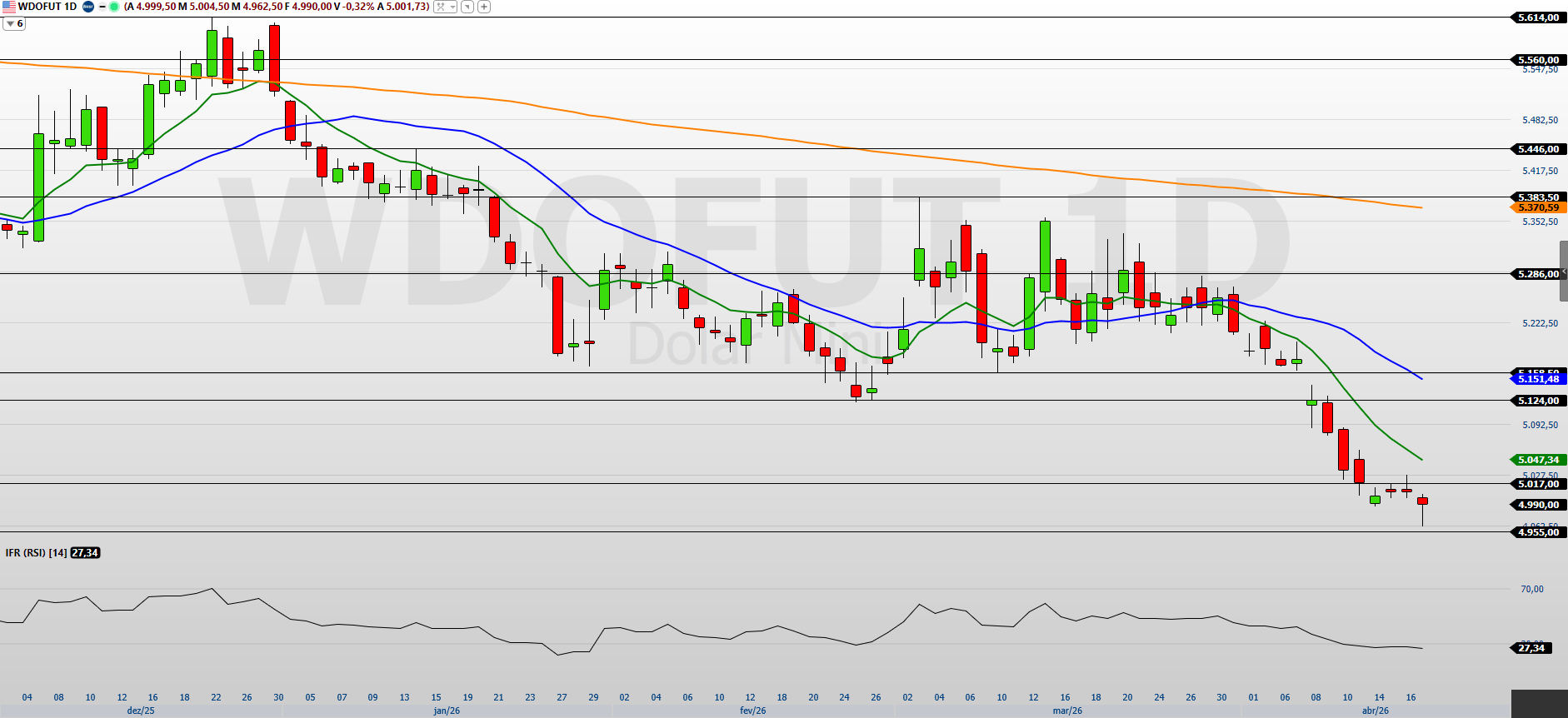 No dólar futuro, sigo vendo uma estrutura técnica de baixa bem definida. O ativo completou cinco semanas consecutivas de queda e fechou a última sessão em baixa de 0,32%, aos 4.990 pontos, mantendo negociação abaixo das médias móveis de 9 e 21 períodos.