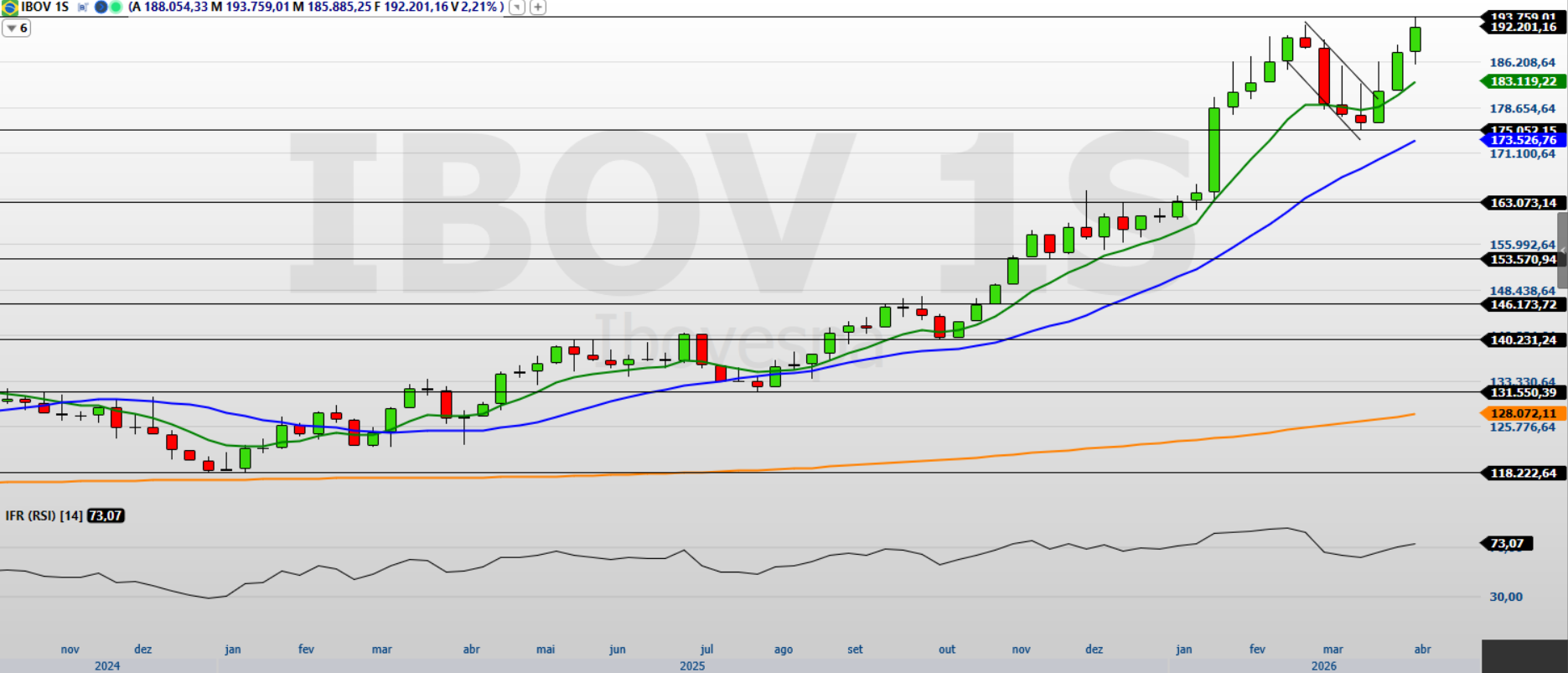 O IFR (14) em 73,07 já indica condição de sobrecompra, o que eleva o risco de movimentos corretivos pontuais, embora ainda sem sinais claros de reversão. Para continuidade do movimento altista, será necessário superar novamente a máxima em 193.759 pontos, abrindo espaço para projeções em 196.060, 200.000 e níveis mais elevados como 202.200 / 208.320, com extensão até 215.000 pontos.