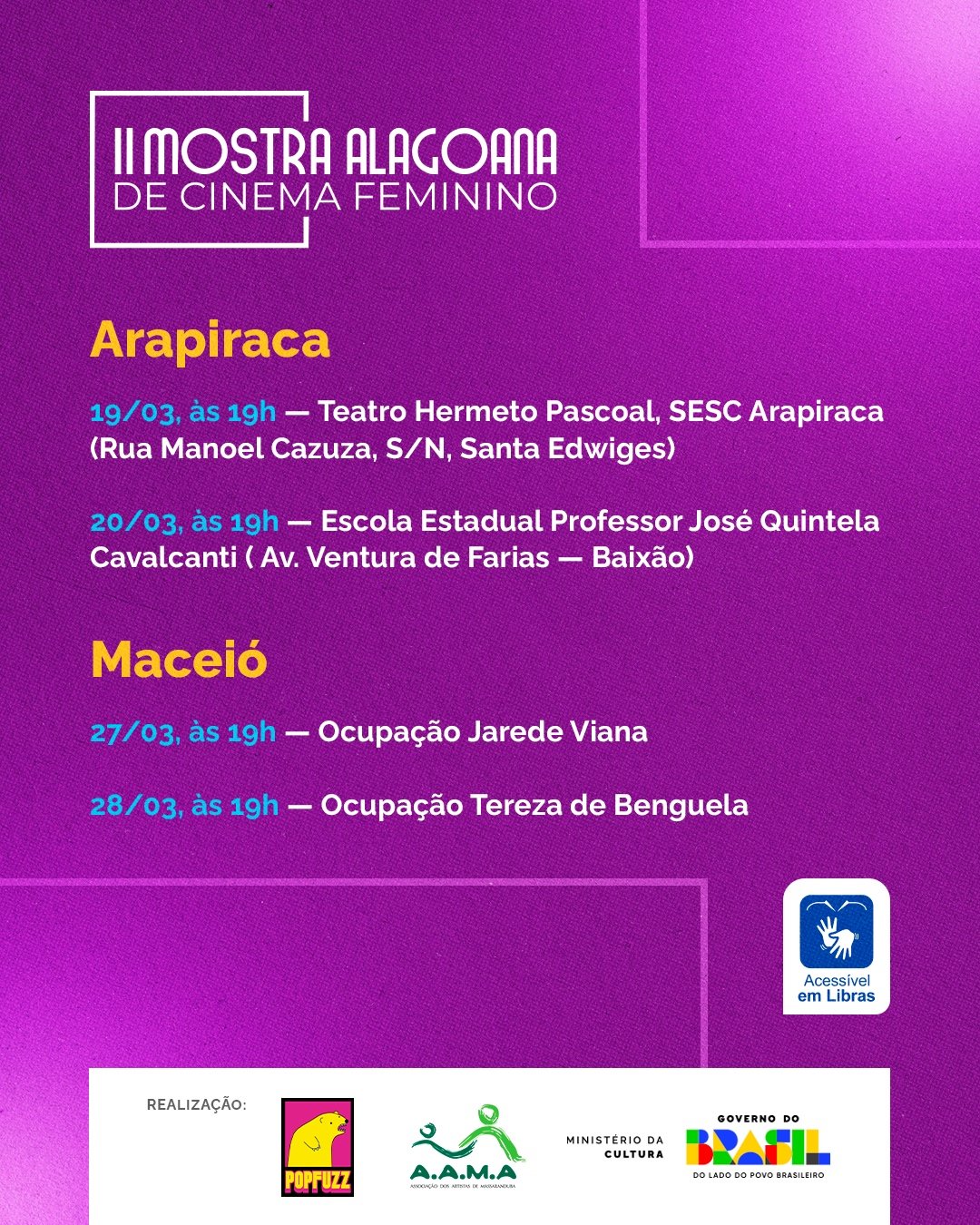 Com entrada gratuita e acessibilidade em Libras, a mostra amplia o acesso do público e reafirma seu compromisso com a inclusão. Nesta edição, o evento percorre duas cidades — Arapiraca e Maceió — com dois dias de programação em cada local, promovendo sessões que reúnem curtas-metragens de ficção, documentário e obras híbridas dirigidas por realizadoras alagoanas.