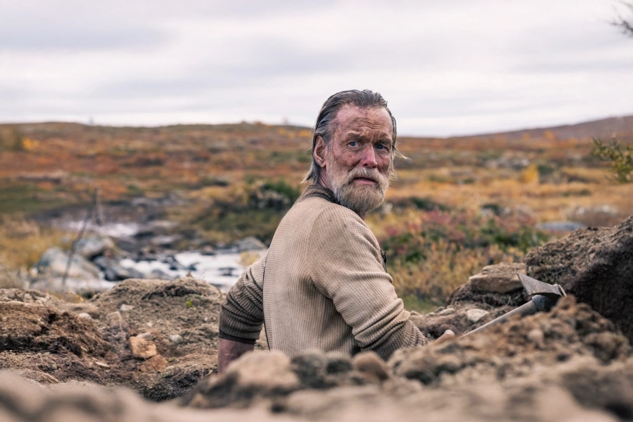“Sisu — Uma História de Determinação” articula sua narrativa a partir de um período histórico marcado pelo desgaste absoluto: os meses finais da Segunda Guerra Mundial na Lapônia. Nesse cenário árido, devastado por retirada alemã e destruição sistemática, Aatami Korpi, interpretado por Jorma Tommila, é apresentado como um garimpeiro solitário que trabalha em silêncio, movido por um objetivo pragmático: extrair ouro suficiente para recomeçar a vida longe de qualquer resquício de conflito. A descoberta de uma quantidade significativa do metal altera o curso de sua jornada. A ambição não aparece nele, mas nos soldados nazistas que cruzam seu caminho, liderados pelo oficial Bruno, interpretado por Aksel Hennie. A partir desse encontro, a narrativa assume o ritmo de perseguição contínua, com cada decisão ancorada na lógica de sobrevivência e na preservação do que Aatami conquistou com esforço extremo.