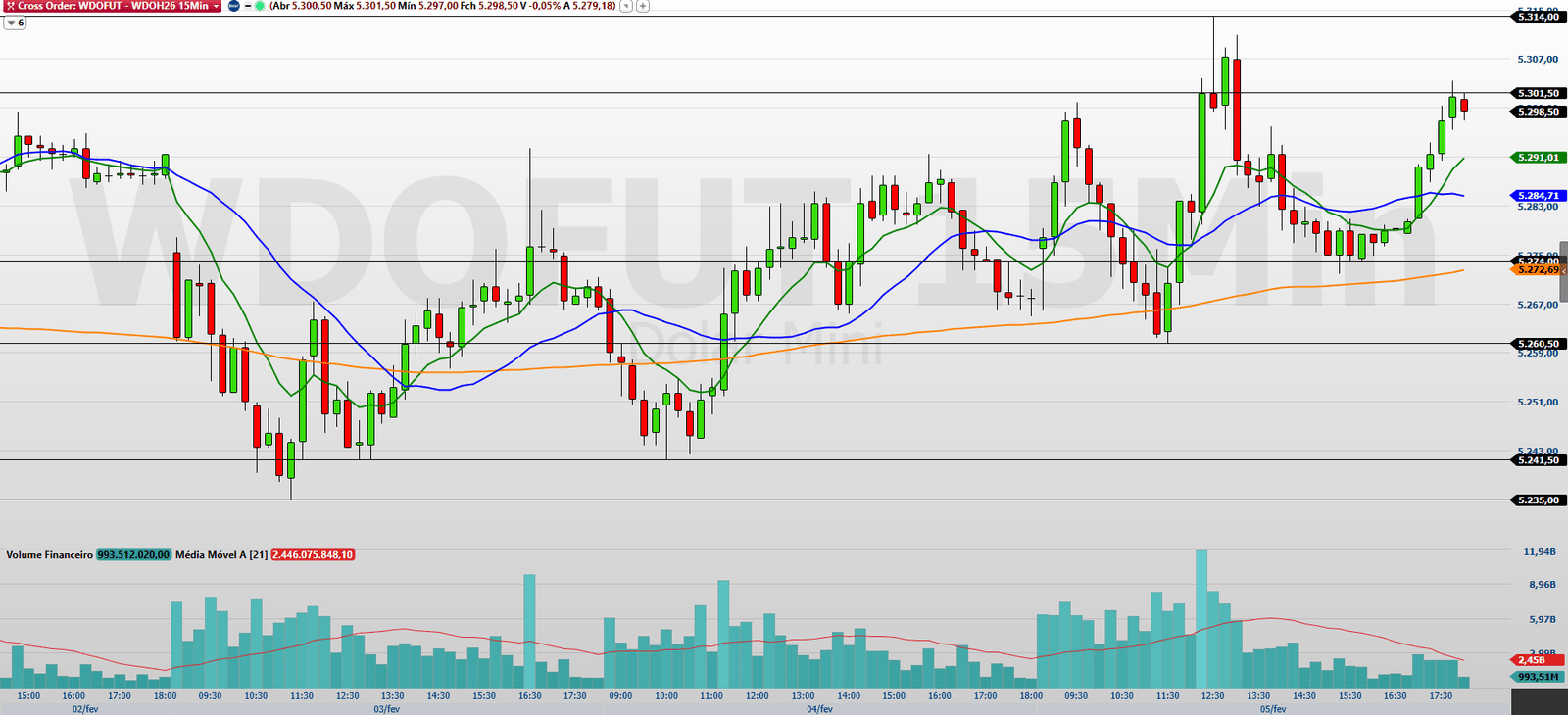 No intraday, o minidólar fechou em alta e acima das médias móveis de 9 e 21 períodos, reforçando a leitura de curto prazo mais favorável. Para dar sequência ao movimento, será essencial a entrada de volume comprador que permita a superação da resistência em 5.301,5/5.314 pontos. Vencida essa faixa, o mercado tende a buscar 5.328/5.337,5, com projeção mais longa em 5.348/5.361 pontos.