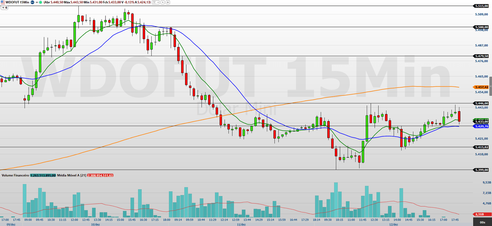 No gráfico de 15 minutos, observo que o minidólar fechou levemente no positivo, negociando entre as médias móveis de 9 e 21 períodos, o que reforça um cenário de consolidação no curtíssimo prazo. Para que o ativo volte a ganhar tração compradora, será fundamental a entrada de volume capaz de romper a resistência em 5.446/5.457,5 pontos, abrindo espaço para avanços em 5.479,5/5.500 e, mais adiante, 5.515/5.522 pontos.