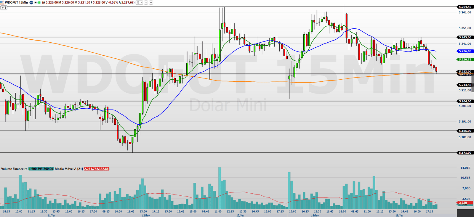 Por outro lado, a perda do suporte em 5.221,5/5.214,5 pontos tende a intensificar o fluxo vendedor. Abaixo dessa faixa, o mercado pode acelerar em direção a 5.204/5.185, com alvo mais longo na região de 5.171/5.153 pontos. O comportamento do preço nesses níveis deve definir o ritmo do pregão.