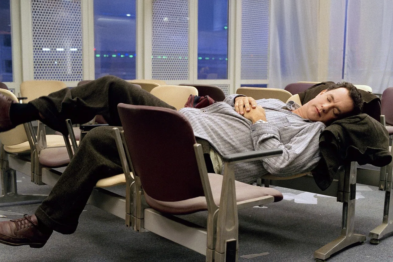Spielberg filma o aeroporto como uma cidade de luz artificial, onde o tempo é marcado por anúncios em alto-falante e pela troca de turnos. Ao acompanhar Viktor em deslocamentos longos pelos corredores, a câmera cria a sensação de movimento sem liberdade: ele anda muito e continua no mesmo perímetro. Quando o filme volta aos painéis de voos, a repetição aperta a experiência, porque a informação muda e a prisão fica; é isso que regula o humor. O riso nasce do choque entre literalidade e protocolo, e a ternura surge quando um detalhe concreto, um copo d’água, um sanduíche, uma palavra bem escolhida, muda a temperatura do lugar.