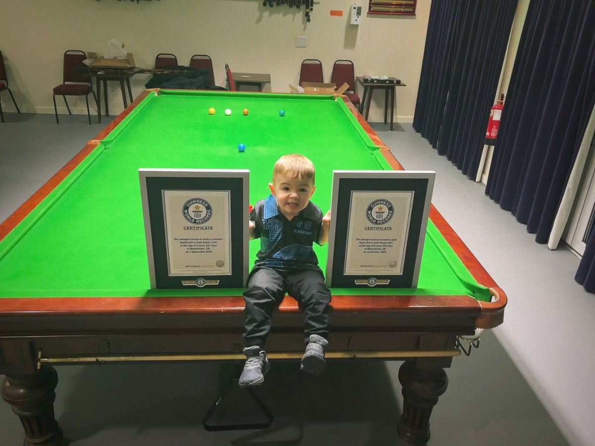 | Com apenas 2 anos e 261 dias de idade, Jude Owens, de Manchester, Inglaterra, tornou-se a pessoa mais jovem a fazer uma tacada dupla no snooker. Depois, aos 2 anos e 302 dias, Jude estabeleceu o recorde do Livro Guinness de pessoa mais jovem a fazer uma tacada de tabela no bilhar. Jude aprendeu a jogar com seu pai, na mesa de sinuca que ele tem em casa. Seu pai reconheceu e incentivou o talento do filho desde que ele comeou a andar e comprou uma mini-mesa para ele brincar. |