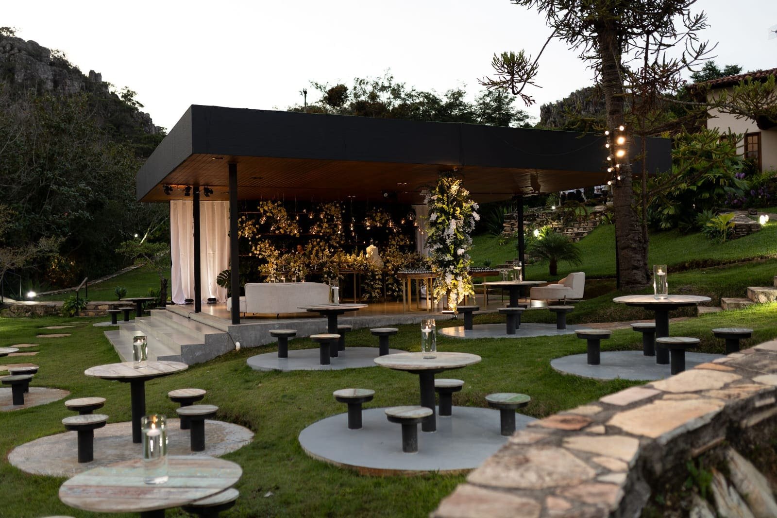 Aninhada aos pés da Serra dos Cristais, a Vila da Serra oferece estrutura para celebrações personalizadas. O espaço aproveita o relevo, a vista e a luminosidade naturais para criar eventos que valorizam o entorno e reforçam o conceito de casamento integrado à paisagem.