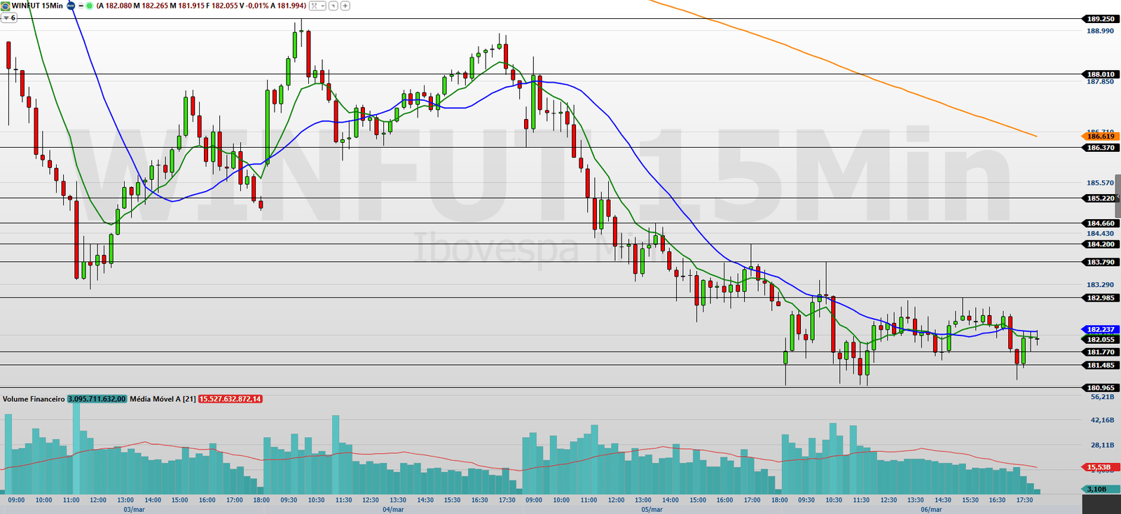 No gráfico de 60 minutos, o mini-índice negocia abaixo das médias de 9 e 21 períodos, o que mantém o viés baixista no curto prazo.