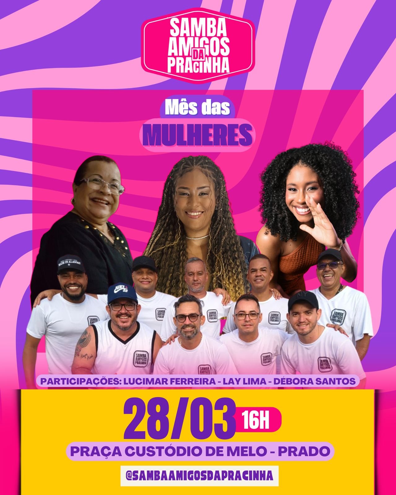 As cantoras Lucimar Ferreira, Lay Lima e Debora Santos são as convidadas da “Edição Mulher”, do projeto Samba Amigos da Pracinha, que acontece no próximo sábado (28), no bairro de Prado e de forma gratuita, num encontro de muita música, cultura e representatividade.