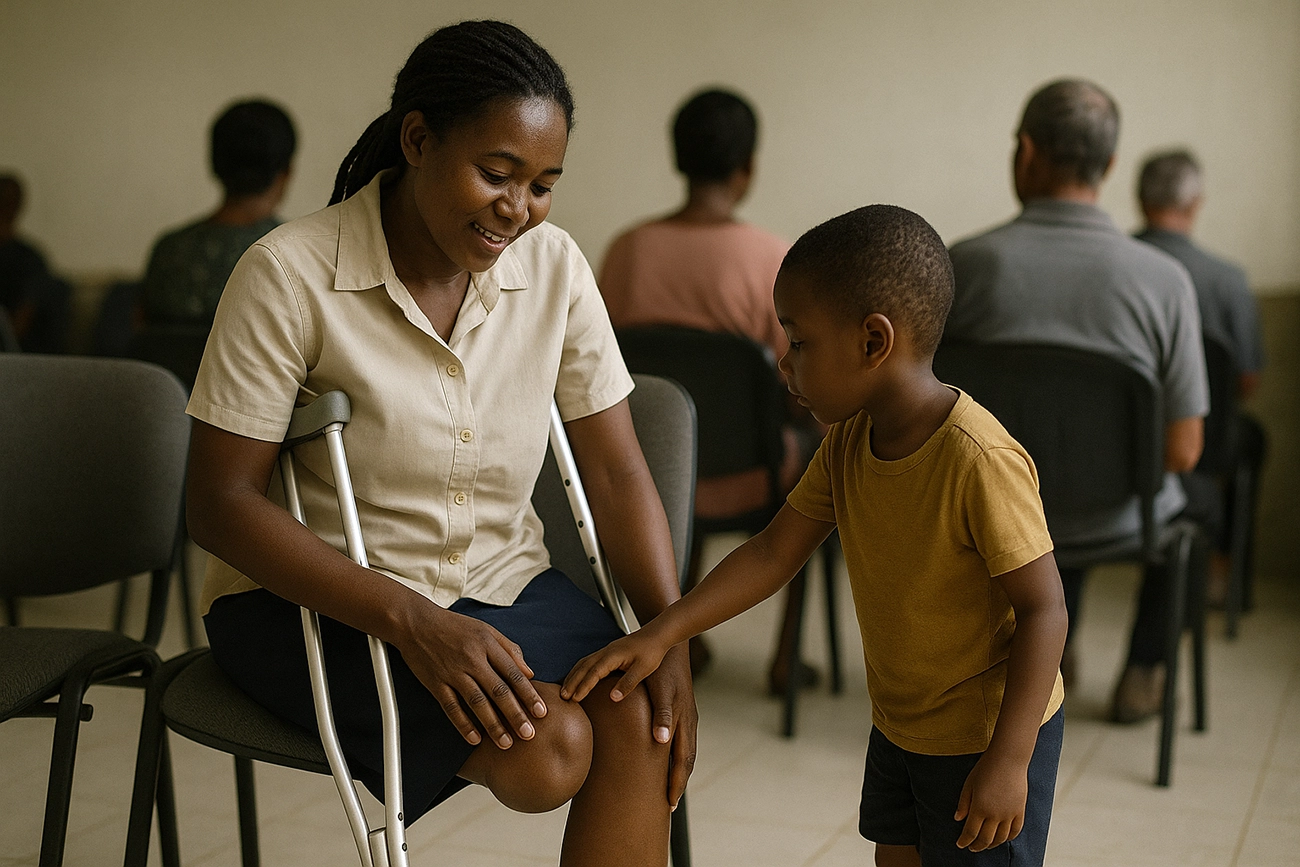 O moleque faceiro correu para o colo da mãe. Passados cerca de vinte minutos, Yelissa saiu do consultório, ainda apoiada em muletas, mas, levando afixada no corpo uma prótese que fora doada pela Medecins Sans Frontieres. Akin ainda esperava a sua vez de se consultar quando foi surpreendido pela cena.