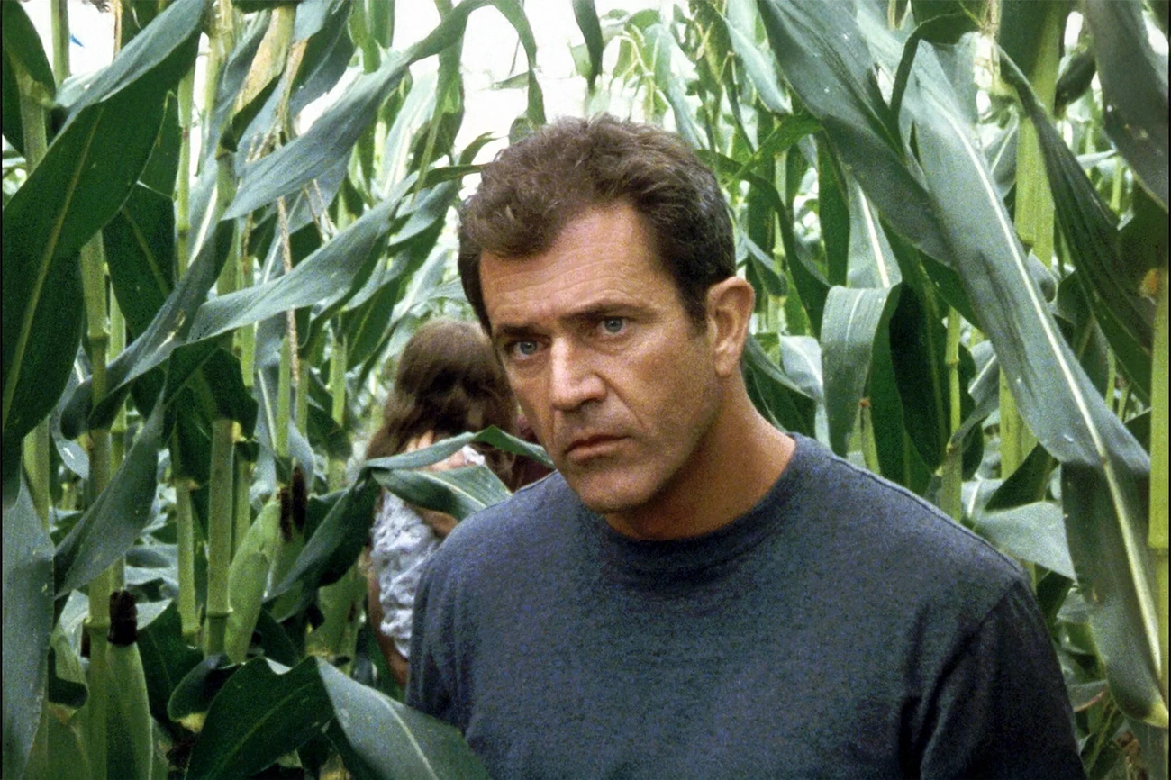 O desconforto silencioso que envolve “Sinais” começa antes mesmo que qualquer alienígena cruze o enquadramento; ele se infiltra na rotina esvaziada de Graham Hess, interpretado por Mel Gibson, como se o luto, e não a visita extraterrestre, fosse o verdadeiro corpo estranho naquela fazenda isolada. Ao acompanhar Graham, Bo de Abigail Breslin, Morgan de Rory Culkin e Merrill de Joaquin Phoenix, percebe-se que o filme opera menos como narrativa de invasão e mais como um inventário das rachaduras emocionais que um homem tenta camuflar enquanto o mundo lá fora, ironicamente, parece mais disposto a desabar do que ele próprio. Os primeiros indícios nos campos de milho funcionam como uma espécie de arranhão na superfície de uma vida que já estava à beira do colapso, e é nesse choque entre o íntimo e o épico que a história encontra sua força.