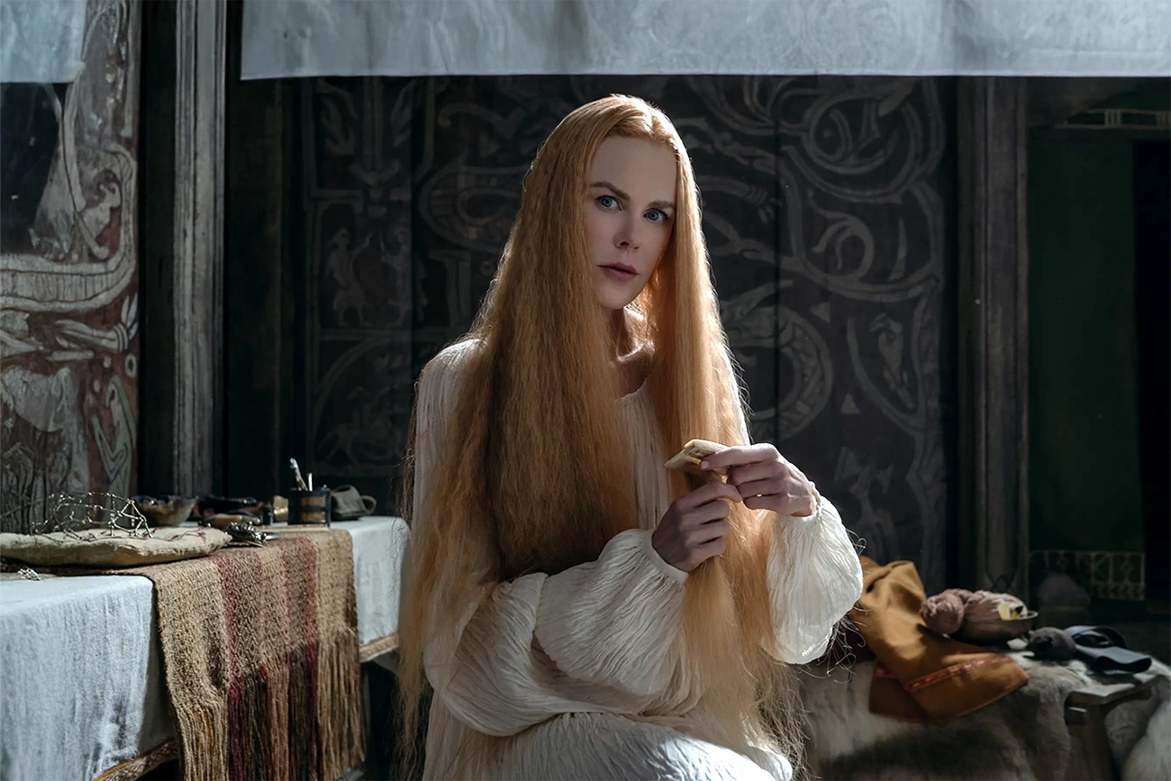 O filme acompanha esse retorno como uma descida consciente ao inferno pessoal. Amleth não volta como príncipe, mas como alguém disposto a perder tudo para cumprir o que prometeu. Ele se infiltra no território onde Fjölnir vive agora, num cenário duro e isolado da Islândia do século 10, e passa a conviver com aqueles que deveria destruir. A tensão não vem de reviravoltas fáceis, mas da proximidade constante entre vítima e algoz. Skarsgård compõe um protagonista quase animal, movido por instinto e dor, enquanto Claes Bang constrói um antagonista que mistura arrogância e medo, sem caricatura. Nicole Kidman, como Gudrún, traz uma presença inquietante, sugerindo que o passado daquela família guarda mais camadas do que a lembrança infantil de Amleth permite.