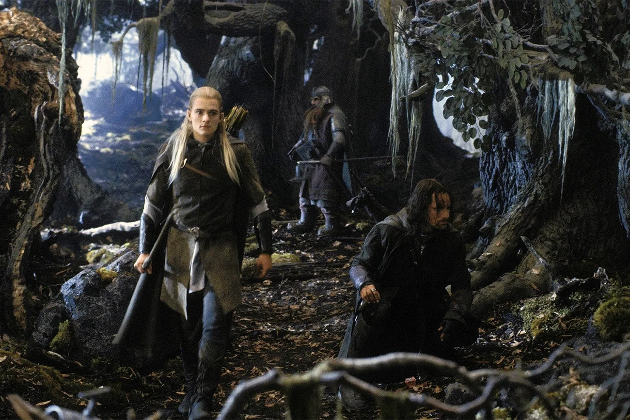 É nesse contexto que Aragorn, de Viggo Mortensen, se consolida como líder relutante. Ele não exibe grandiosidade, mas cansaço. Sua autoridade nasce da consciência de que não há escolha limpa. A aproximação com Legolas, de Orlando Bloom, e Gimli, de John Rhys-Davies, reforça a ideia de alianças construídas não por afinidade, mas por urgência histórica. A guerra deixa de ser evento e passa a ser estado permanente.